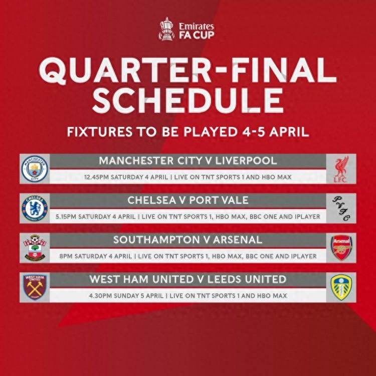 3月13日訊 足總盃官方公佈了1/4決賽的開球時間,曼城vs利物浦4月4日19點45分開球。