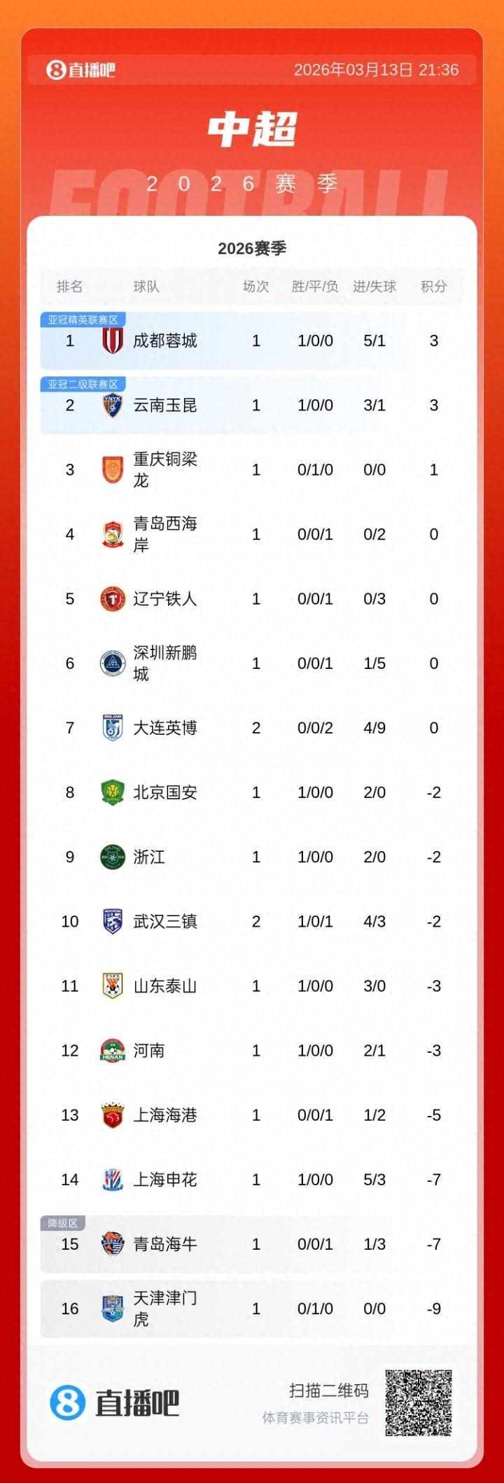 03月13日訊 中超第2輪今晚先賽一場,武漢三鎮4-1大勝大連英博,大連英博遭遇開賽兩連敗,積分仍爲0分,理論上本輪就會被負分球隊反超。