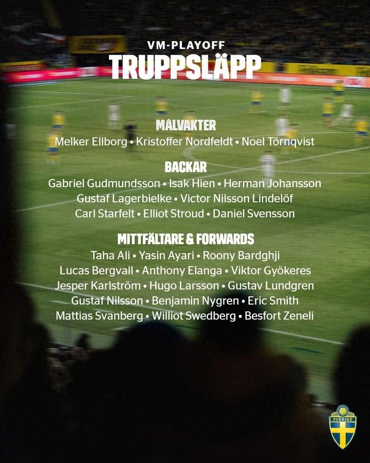 3月18日訊 瑞典公佈最新一期國家隊大名單,約克雷斯、伊蘭加、林德洛夫等球員入選,伊薩克、庫盧傷缺。