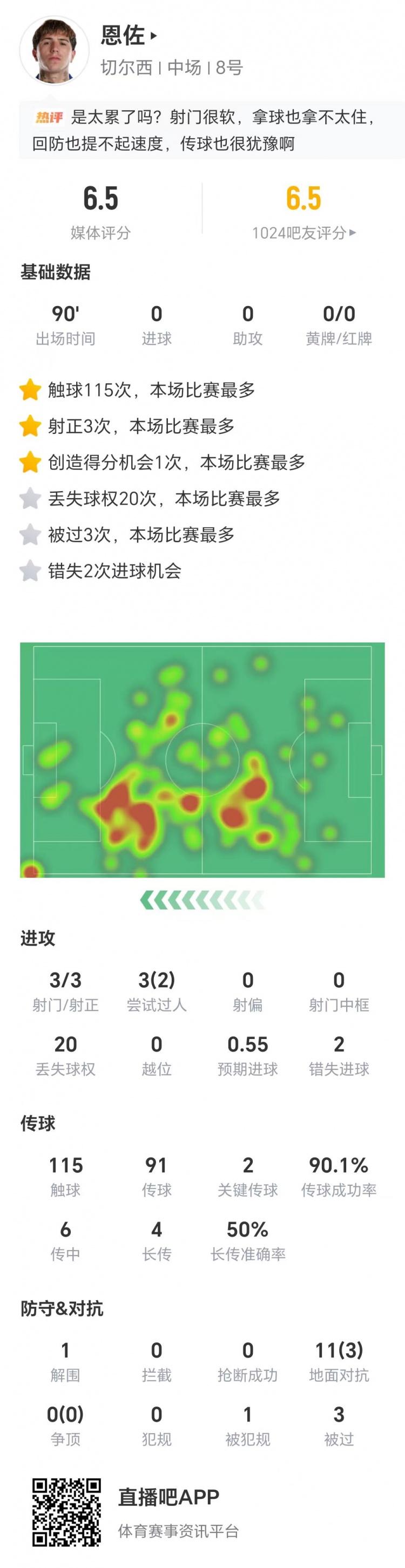 賽後技術統計數據顯示,恩佐本場比賽3射3正,3次過人兩次成功,20次丟失球權,兩次錯失進球,兩次關鍵傳球,11次地面對抗僅成功3次,獲評6.5分。