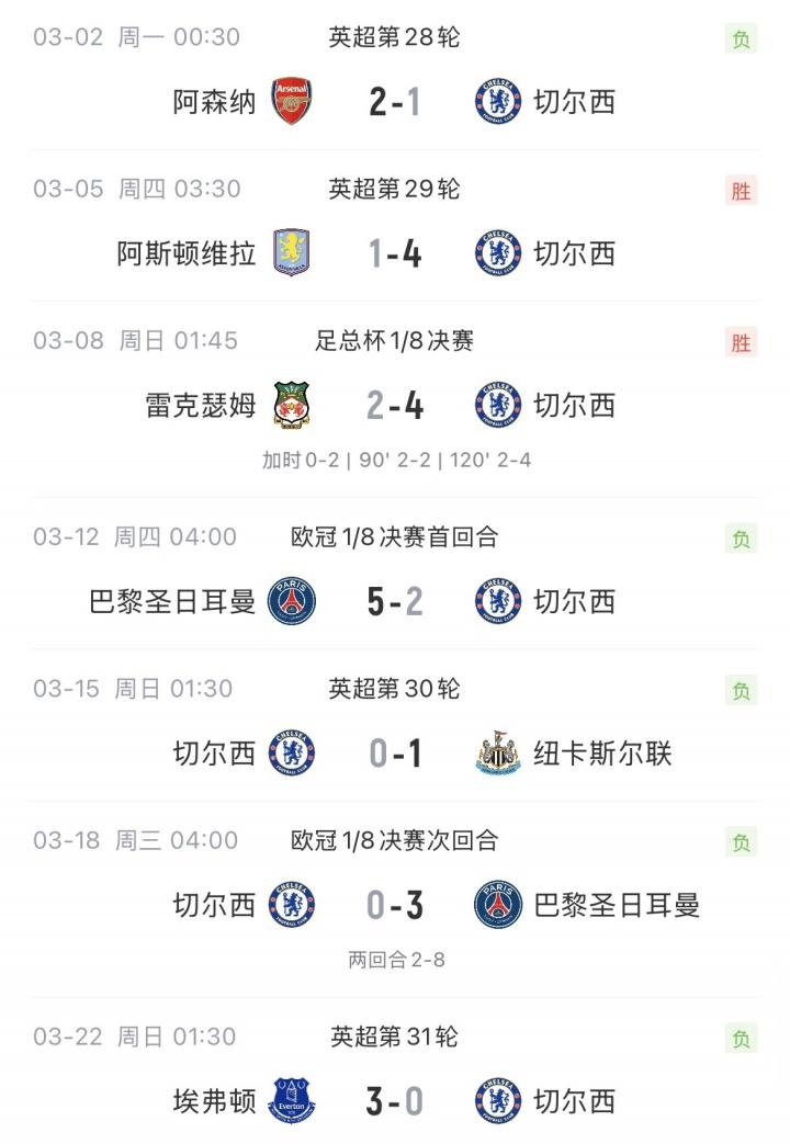 二月份,切爾西共出戰6場,取得3勝2平1負的戰績。三月份,切爾西各賽事2勝5負,歐冠2-5、0-3慘敗巴黎出局。