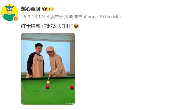 趙心童則在微博曬出與周星馳的合照,表示:終於練成了“超級大扎杆”。