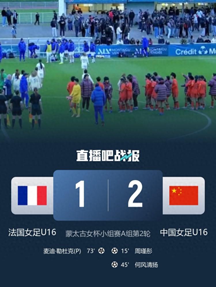 04月02日訊 北京時間4月2日00:30,蒙太古女杯小組賽A組第2輪,中國女足U16在法國馬克西姆·博西斯體育場對陣法國女足U16。上半場,周瑾彤憑藉任意球直接破門爲中國隊取得領先;下半場開場,何風清揚禁區內停球轉身低射擴大比分,隨後法國隊依靠點球扳回一城。最終,中國女足U16 2-1擊敗法國女足U16。小組賽第三輪,中國女足U16將在北京時間4月4日00:30對陣墨西哥女足U16,法國女足U16則將對陣英格蘭女足U16。