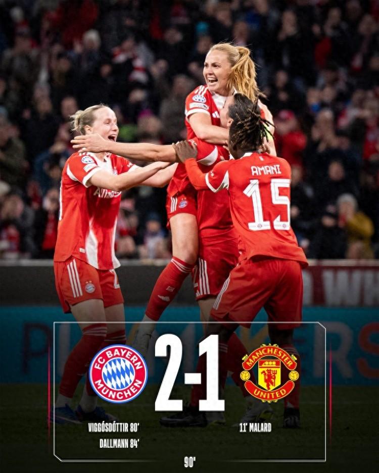4月2日訊 女足歐冠1/4決賽次回合,拜仁女足以2-1的比分擊敗曼聯,以兩回合總比分5-3闖進半決賽。