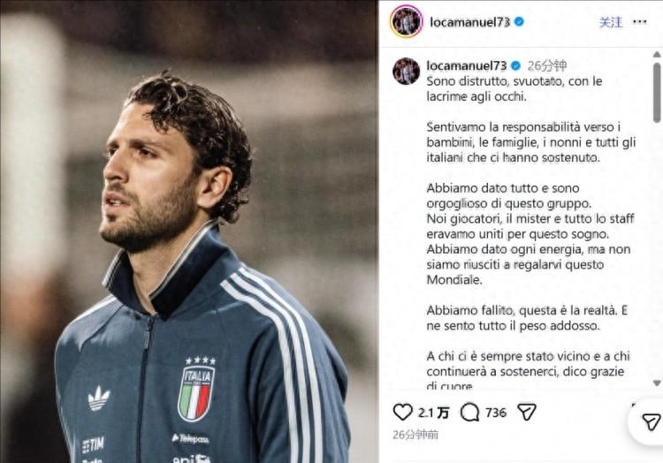 4月2日訊 在意大利無緣世界盃正賽後,意大利國腳洛卡特利更新了社交媒體。