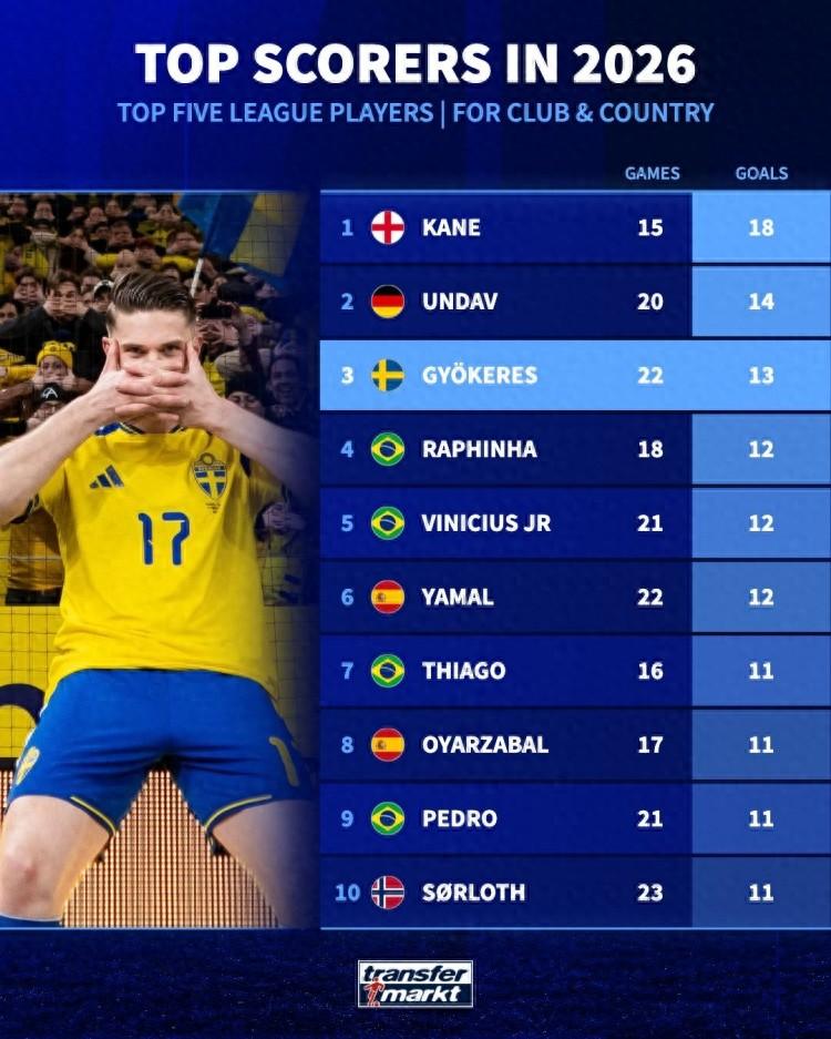 4月2日訊 世預賽附加賽決賽,約克雷斯打進絕殺球幫助瑞典拿到世界盃入場券。進入2026年,約克雷斯在俱樂部和國家隊已經打進13球,位居五大聯賽所有球員第3位。