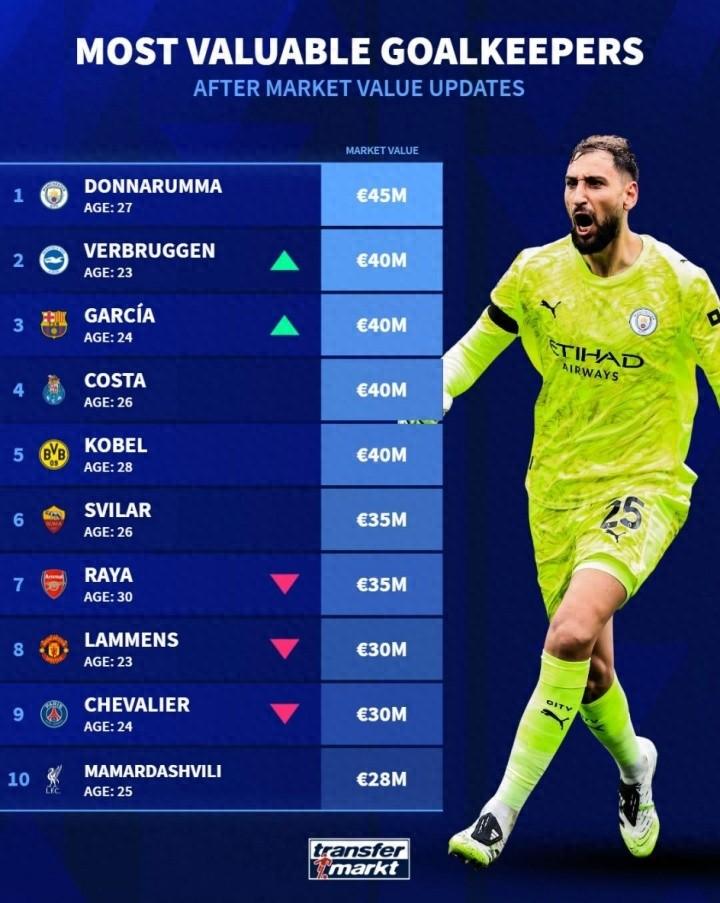 4月5日訊 轉會市場網更新了門將身價排行榜,目前曼城門將多納魯馬身價4500萬歐元最高,在他身後是布萊頓門將維爾布魯根,身價4000萬歐元。