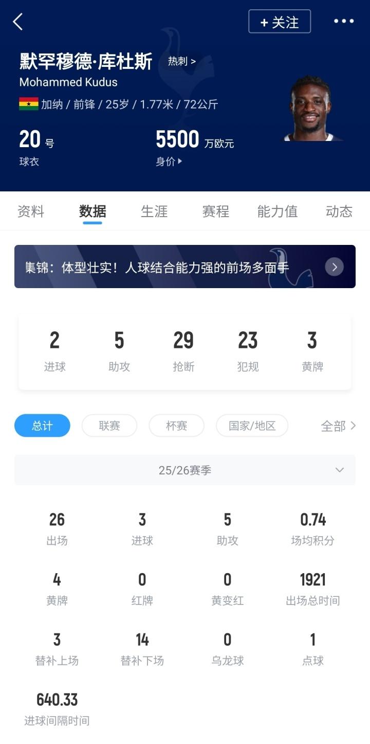 庫杜斯本賽季爲熱刺出戰26場比賽,貢獻3球5助,但從1月開始便一直傷缺,目前德轉身價5500萬歐。