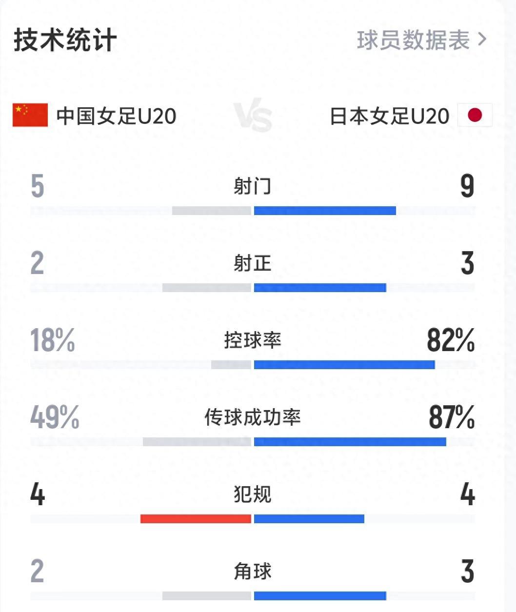 04月15日訊 女足U20亞洲盃半決賽,中國半場0-2日本,半場數據如下。
