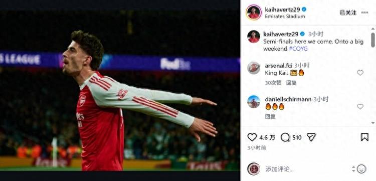 阿森納球員哈弗茨社媒曬出慶祝的照片,配文:“半決賽我們來了,迎接一個重要的週末。”
