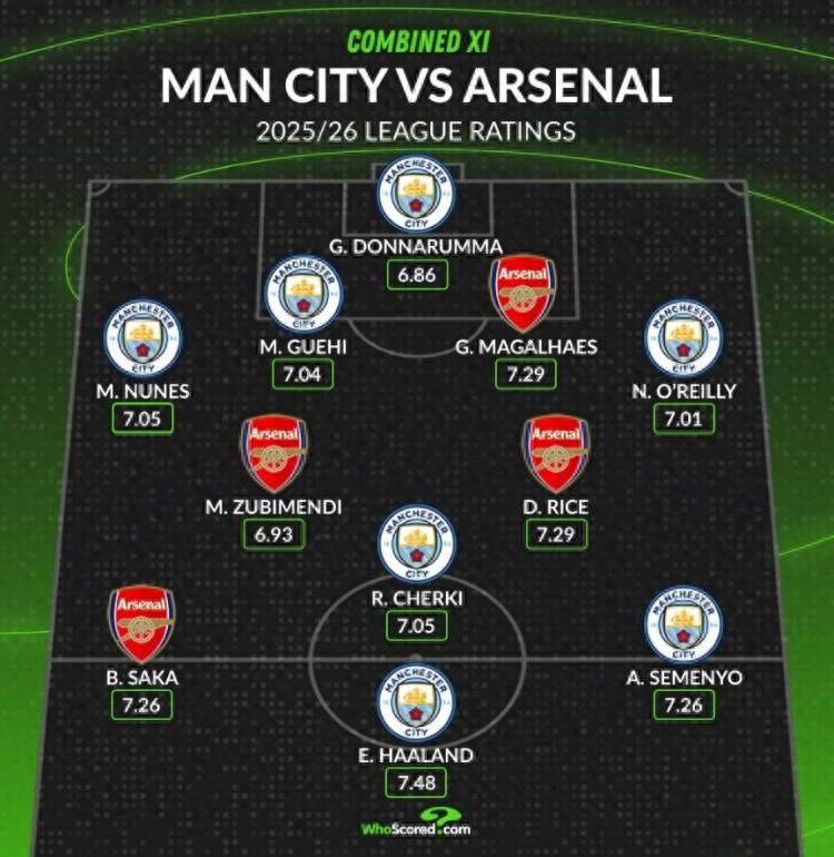 4月19日訊 本輪英超焦點戰曼城對陣阿森納即將打響,數據網站Whoscored也列出本賽季兩隊球員在英超場均評分最高陣,其中曼城7人在列,具體如下: