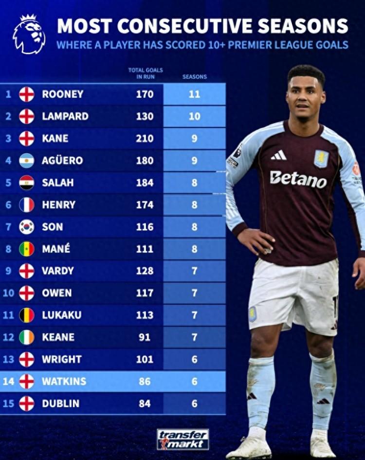 4月20日訊 維拉前鋒沃特金斯本賽季英超進球上雙,這已經是他連續第6個賽季做到這一點。德轉也盤點了英超歷史球員連續進球上雙紀錄榜,具體如下(期間總進球數+連續上雙賽季數):