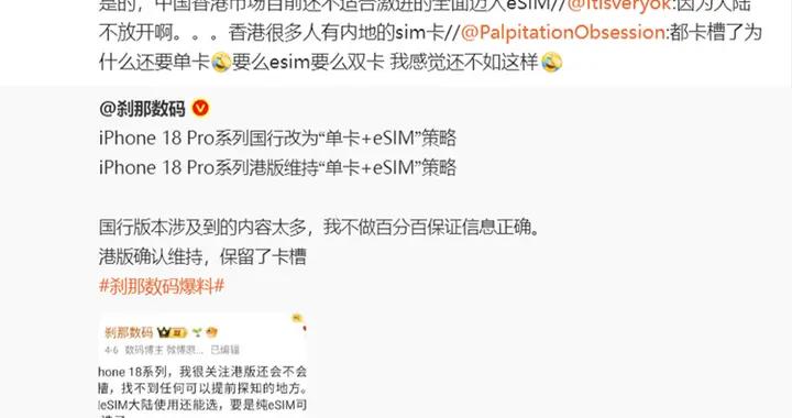 4月20日消息,日前,有爆料稱,蘋果計劃在iPhone18Pro系列的國行版本上調整蜂窩通信卡槽策略,或由現行方案轉向“單卡+eSIM”,意味着將與港版iPhone18Pro系列保持一致。不過爆料者同時提示,國行版本牽涉內容較多,信息準確性尚無法作出百分百保證。如果消息屬實,這將是國行主力旗艦...