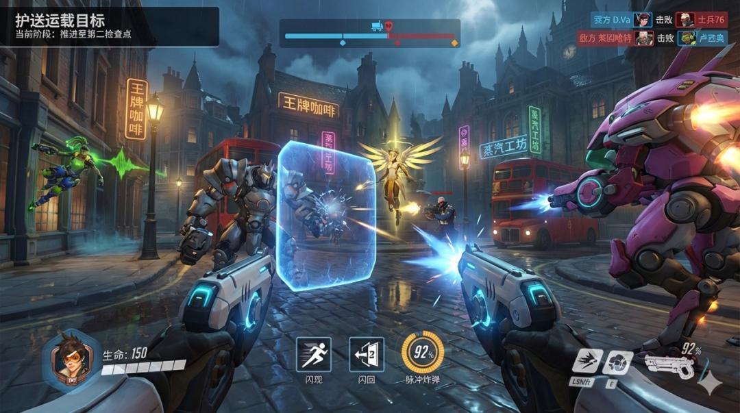 我要求它生成一張“具有《守望先鋒》風格的第一人稱射擊遊戲 HUD 界面,生成的圖像展現出相當驚人的語義理解力,儘管個別 UI 佈局、地圖場景等元素與實際遊戲不同,但遊戲角色、字體風格與遊戲整體美術風格都高度統一,還原程度相當高。