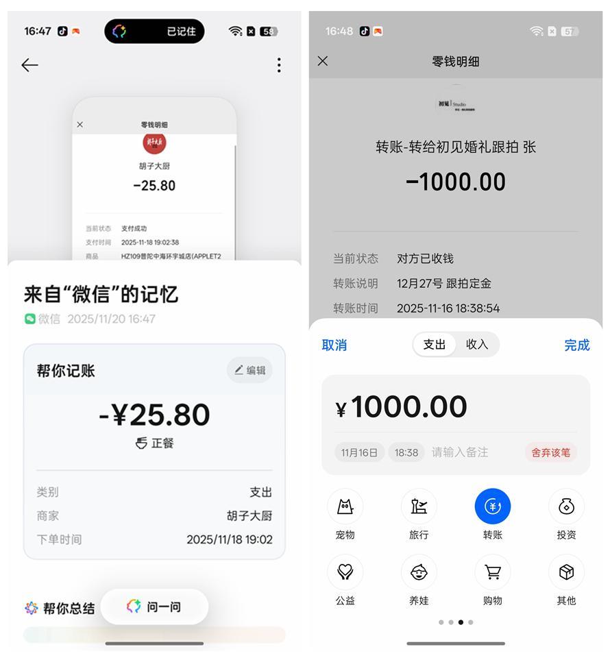 還有一個我覺得很適合用來記賬的小布記憶,以往記賬可能需要打開記賬軟件、輸入金額、花費的內容,比較繁瑣,但是現在只需要“三指上滑”就可以直接記住當前的頁面內容,金額、花費類型都記得明明白白,在小布記憶APP中可以查看到我的賬單。