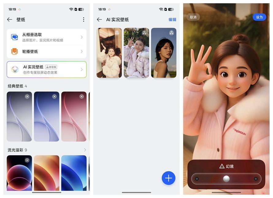 比如在鎖屏上,OPPO Reno15加入了一個AI實況壁紙的選項,可以將自己拍攝的照片用在鎖屏上,即便是靜態的照片,也可以AI轉換爲實況照片當作鎖屏,並且通過AI生成實境、幻境、意境三個選項來選擇。