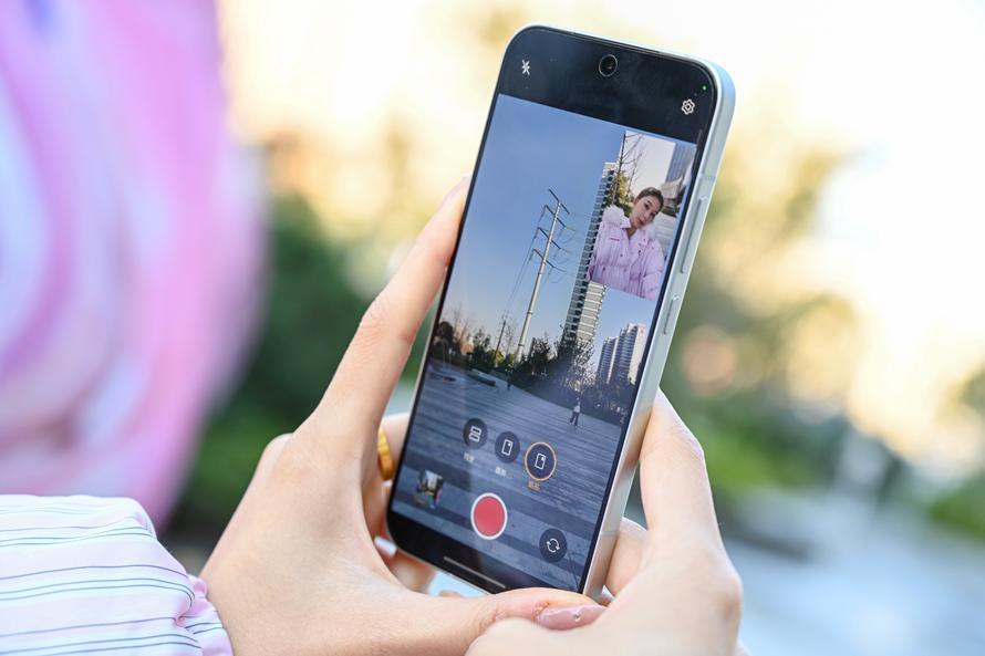 “多景錄像”除了可以前後攝像頭同時拍攝,切換畫面組合的方式以外,這種前後攝像頭一起錄像時,左下角也增加了一個“實況”照片的選項,同樣可以在拍攝時,同時拍下有前後攝像頭的實況照片。