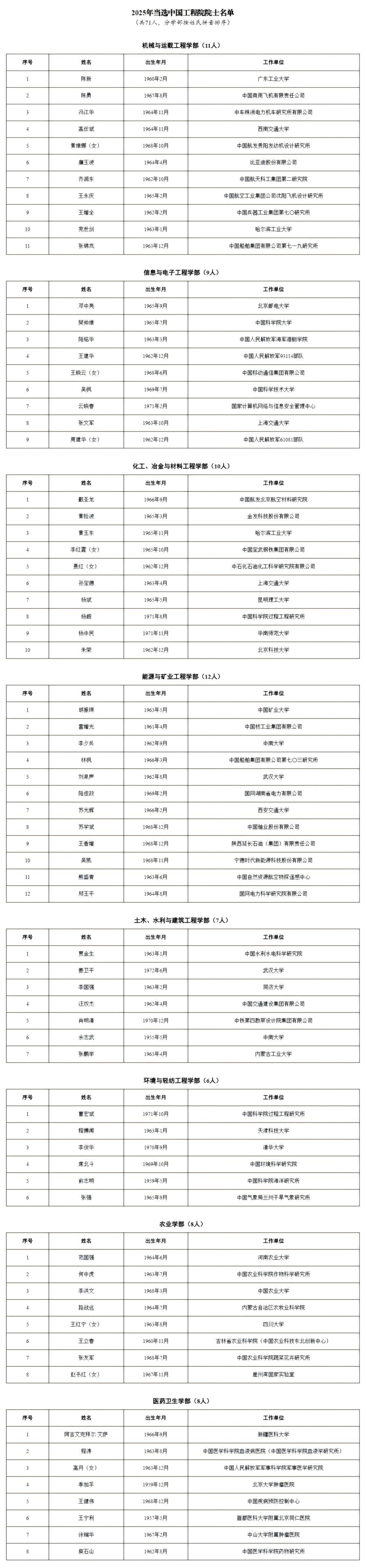 據統計,新當選的中國工程院院士中,機械與運載工程學部 11 人,信息與電子工程學部 9 人,化工、冶金與材料工程學部 10 人,能源與礦業工程學部 12 人,土木、水利與建築工程學部 7 人,環境與輕紡工程學部 6 人,農業學部 8 人,醫藥衛生學部 8 人。