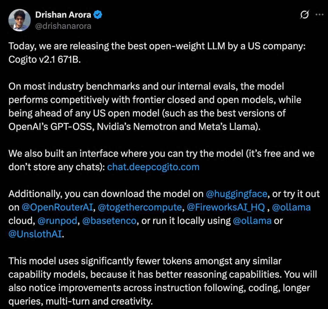 總部位於舊金山的初創公司 Deep Cogito 發佈了其最新一代旗艦模型 Cogito v2.1 671B。公司 CEO Drishan Arora 在社交平臺 X 上豪情萬丈地宣佈:“今天,我們發佈了由美國公司製造的最好的開源大語言模型。”