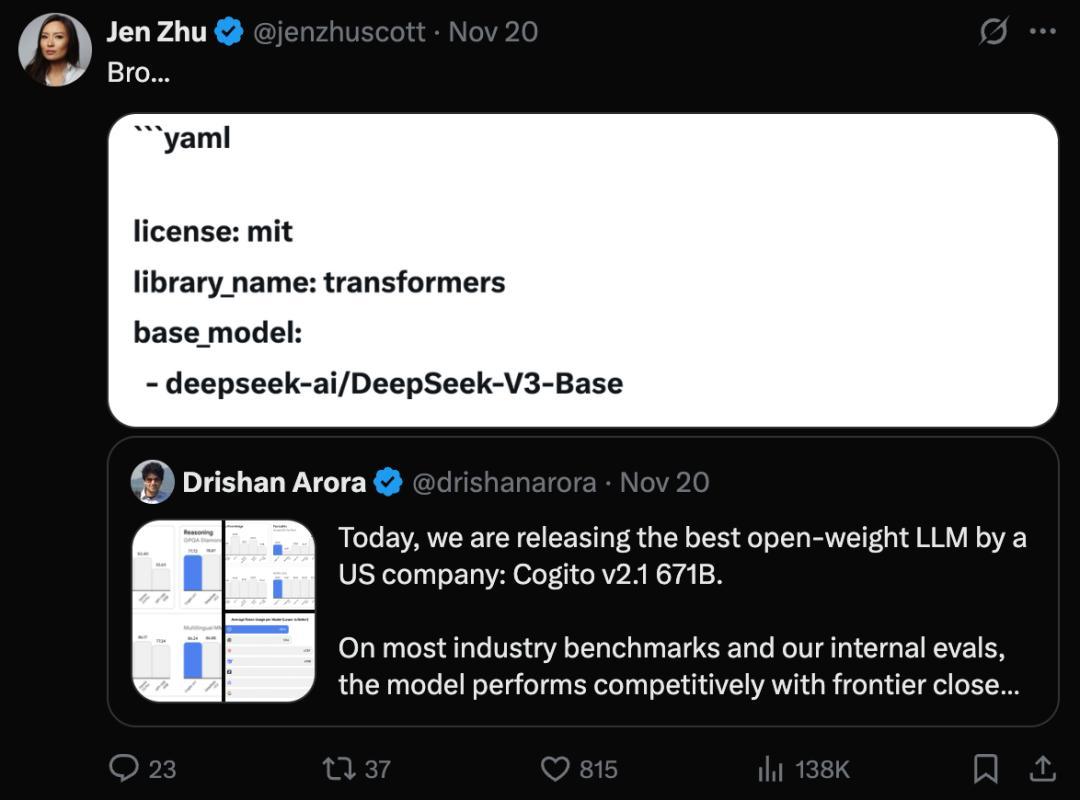 不過,與此前 Cursor 那種死鴨子嘴硬直到被抓包才承認的態度不同,Deep Cogito 完全沒打算藏着掖着。Drishan Arora 表現得相當坦蕩。他直接承認了分叉(fork)自 DeepSeek-V3-Base,並解釋道:在今天的 AI 領域,預訓練(Pre-training)已經變成了像發電一樣的通用商品(commodity)。