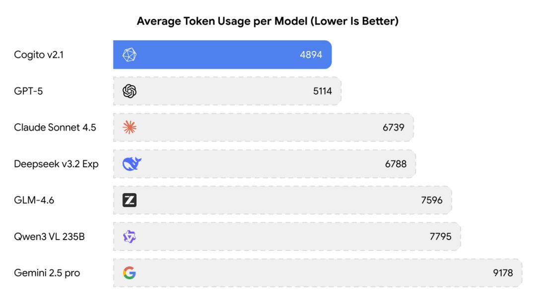 根據官方披露的技術細節,他們利用了數百個 GPU 節點進行了大規模的分佈式強化學習。與其前代產品 Cogito v1 相比,v2.1 在推理效率上實現了巨大進步。在達到同等推理能力的水平下,Cogito v2.1 消耗的 Token 數量顯著低於競爭對手。例如,在處理複雜邏輯問題時,Cogito v2.1 平均消耗 4894 個 Token,而 Google 的 Gemini 2.5 Pro 則高達 9,178 個。
