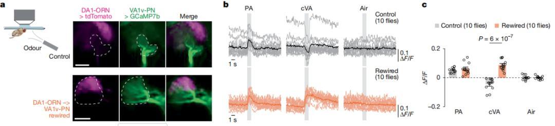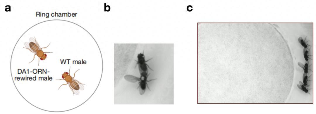 結果發現在正常的果蠅大腦中,VA1v 中轉站只對促進求愛的 PA 氣味有反應,對於禁止求愛的 cVA 氣味則產生了抑制。而在更換線路之後的果蠅大腦裏,VA1v 中轉站同時對 PA 和 cVA 都產生了興奮反應。