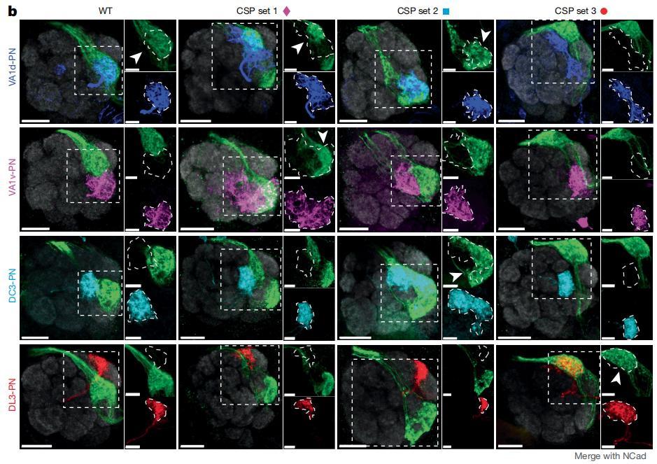 第二類是排斥力“身份證”,它就像同極相對的磁鐵,可以防止神經元與錯誤的夥伴連接。基於此,呂程制定了三重改造策略,只針對 DA1 探測器進行基因改造。