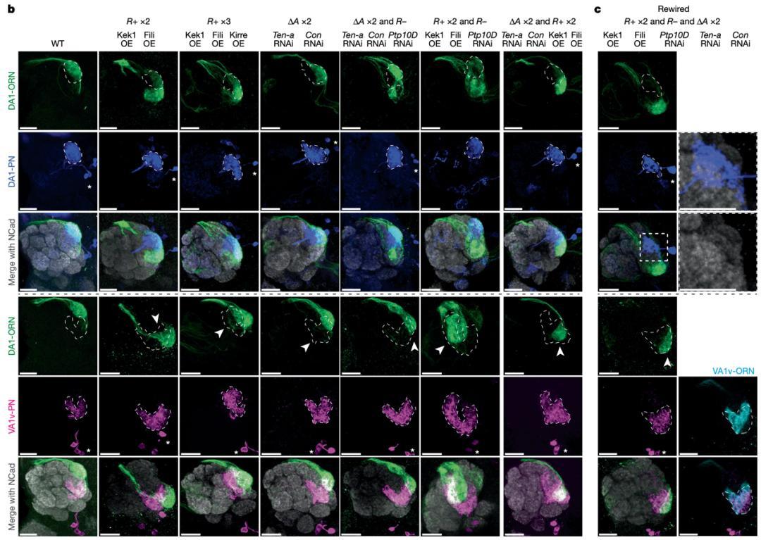 令人驚喜的是,當他將五種特定的蛋白(Kek1, Fili, Ptp10D, Ten-a, Con)進行組合改造時,奇蹟發生了。在顯微鏡下,DA1 探測器的線路幾乎完全脫離了原配的 DA1 中轉站,並與新的 VA1v 中轉站緊密地纏繞在了一起。這意味着果蠅大腦的電路重連首次在解剖結構上實現了。