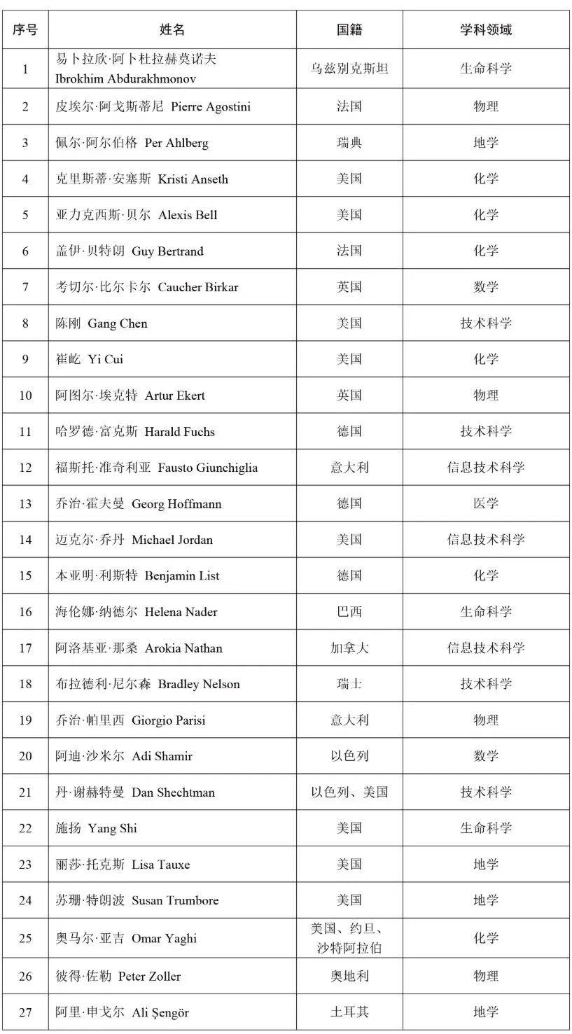2025年新當選中國科學院外籍院士名單