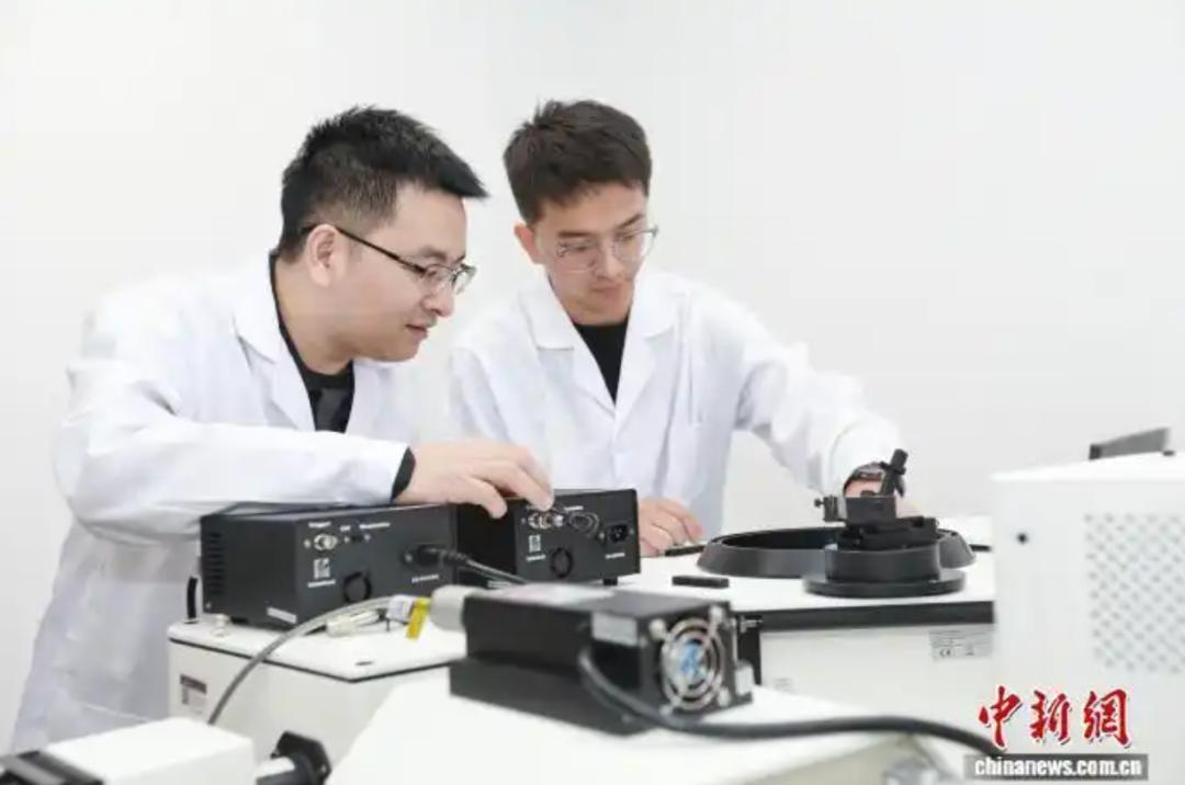 清華大學深圳國際研究生院副教授韓三陽(左)與其學生張鵬正在進行實驗。(清華大學供圖)