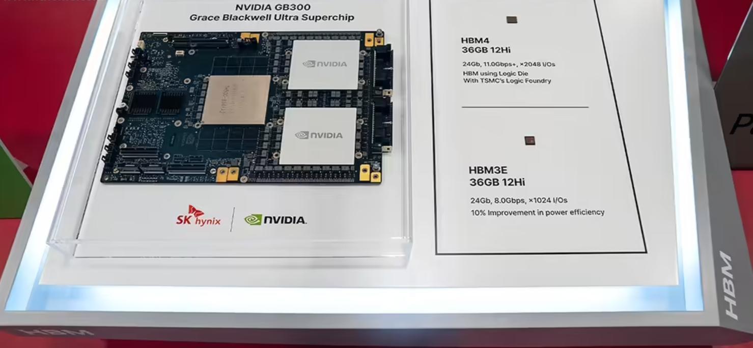 據介紹,SK海力士通過增加芯片堆疊層數和先進接口設計來實現帶寬升級;通過自主創新的Advanced MR-MUF技術,來控制芯片堆疊時的翹曲現象從而顯著提升散熱性能和穩定性。如圖,超級計算大會2025上SK海力士聯合英偉達展出的GB300平臺就採用HBM4內存方案,其擁有2048個I/O通道、11Gbps數據傳輸速率、12Hi 24GB 顆粒堆疊。