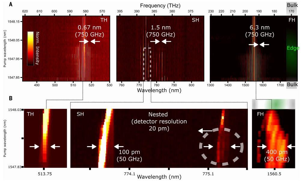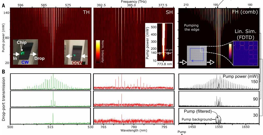 這個巧妙的結構形成了密集的光學模式網絡,讓紅外光可以同時高效轉化爲二次、三次甚至四次諧波,在芯片上被動生成從紅外到藍紫的絢麗光譜。