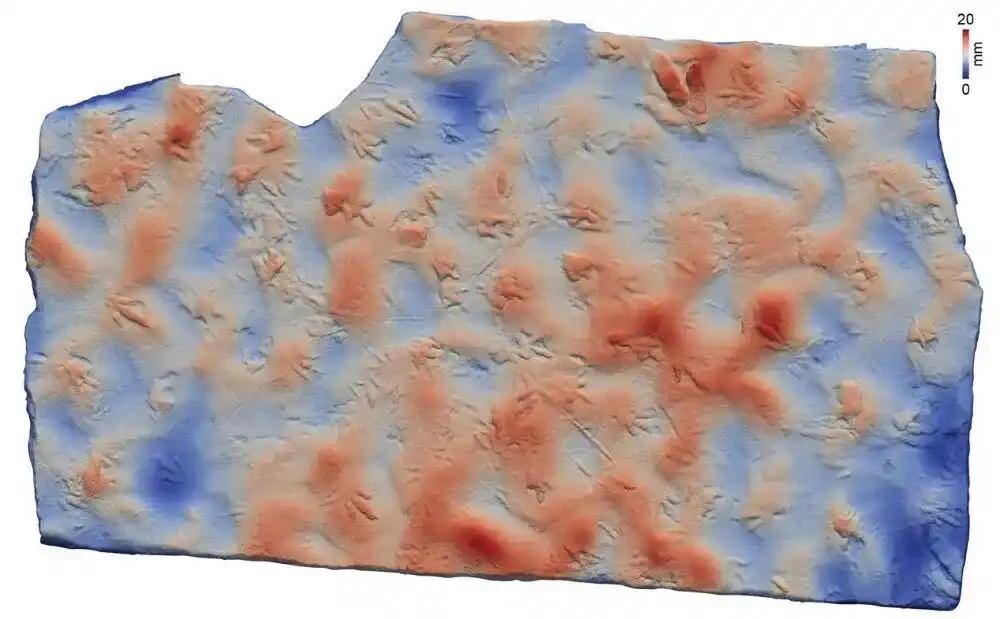 研究發現,這 8 塊石板上的足跡密度極高,其中一塊每平方分米就有約 2 個足跡,是中國下侏羅統中密度最高的獸腳類足跡記錄之一。這些足跡大多是蹺腳龍留下的,平均長度 14.5 釐米,腳趾印上能看到清晰的圓形趾墊和尖銳爪痕;還有部分較大的足跡屬於實雷龍,最大的長達 22.5 釐米。通過精確測量和分析,研究人員判斷這些小型獸腳類恐龍的運動方式類似現代鳥類的 “接地奔跑”,速度大概在每小時 5.8 到 8.6 公里。