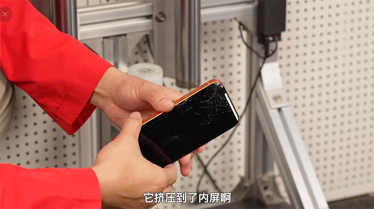 1米正面跌落測試時,華爲外屏、內屏終於碎了,退出正面測試,而小米則穩穩通過。至於iPhone,正面外屏在前面的測試裏已經碎了,該項目不參加。