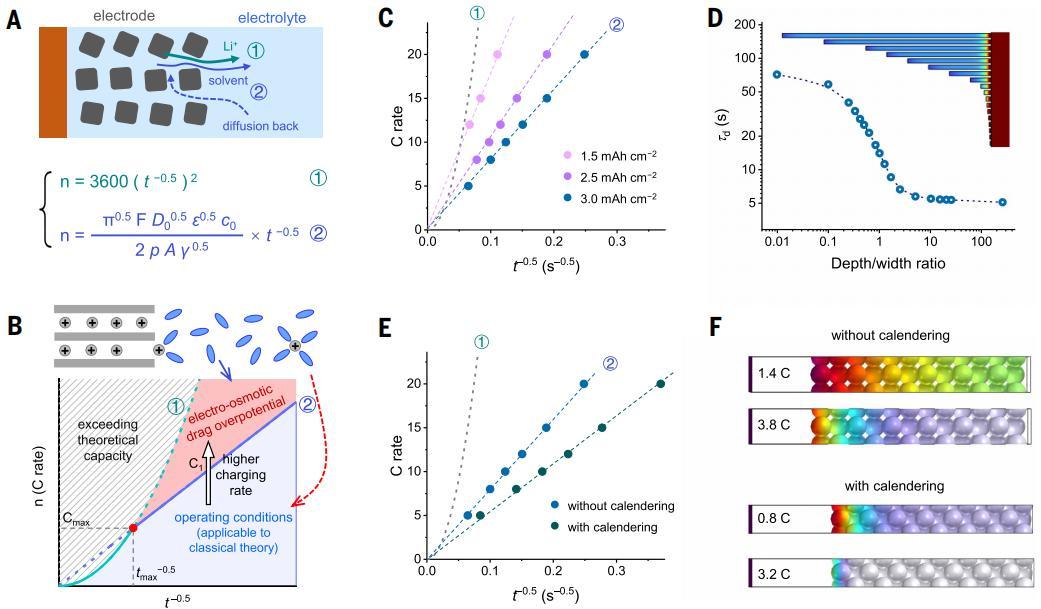此次新發現的電滲拖拽現象,是阻礙高能量密度電池實現快充的關鍵瓶頸。基於這一規律,他們通過新的電解質設計,成功協調了離子與溶劑的運動,最終使厚電極、高能量密度電池在短時間內快速充電成爲現實。
