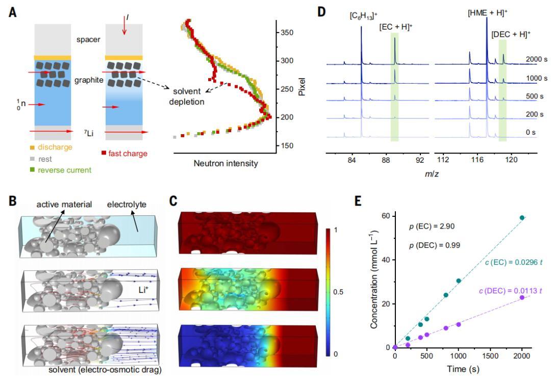 爲此,該團隊使用中子成像這一技術來抓拍電滲拖曳這個“小偷”。由於中子對於溶液中的氫原子非常敏感,爲此他們設計了一個實驗,讓電池裏僅有溶劑含有能被中子看見的氫原子。結果他們清晰地看到厚電極內部的氫信號急劇減弱,直接觀察到電池快充時的內部乾旱現象。