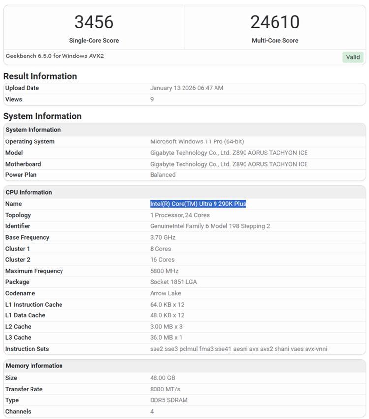 根據多家外媒收集到的消息,本次被爆出的CPU型號爲Intel Core Ultra 9 290K Plus,根據榜單上的顯示數據,該處理器總共爲24核心,爲8個P核+16個E核,在覈心數量以及分佈上與現有的Core Ultra 9 285K完全相同。最高頻率爲5.8Ghz,相比285K略高一些,由此可見290K Plus的主要提升重點還是基於頻率上的。在這次測試中,290K Plus在多核上得到了24610分,單核得到了3456分;而此前的285K多核則是22580分,單核3202分。根據這個粗略結果,大致可以推測出290K Plus的多核性能大約提升9%,單核大約提升7.9%。