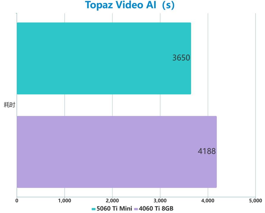 接下來我們把Premiere輸出的FullHD60P放到Topaz Video AI中,然後基於Proteus模型進行AI擴展分辨率,將視頻恢復至4K60P,並對音頻進行重新編碼。實測RTX 4060 Ti 8GB能夠以8FPS速度擴展,10分鐘FullHD擴展至4K視頻總耗時爲4188秒,iGame RTX 5060 Ti Mini速度更快,達到了10FPS左右,總耗時爲3650秒,效率提升了14.7%。