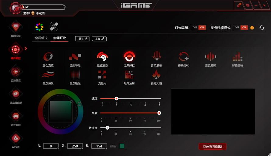 說到RGB自然不能不提軟件iGame自在星球,經歷iGame Zone、iGame center、iGame Center Al Upgarde多次迭代,iGame自在星球已經不只是一款簡單調節RGB燈效、監控電腦信息的軟件。在燈光效果方面,它加入了空間燈效模式,能夠兼容兩種內存燈光底層,讓不同品牌、不同型號內存都能擁有一致的燈光效果。如果你使用了多款七彩虹設備時,iGame自在星球在啓動時,會自動加載不同的底層代碼,不但能更好適配不同硬件,而且下載的數據量更少,保持系統乾淨。