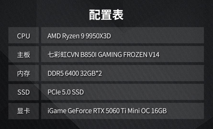 接下來我們看看性能實測,測試基於AMD平臺進行,處理器是AMD Ryzen 9 9950X3D,主板是七彩虹CVN B850I GAMING FROZEN V14,搭載了DDR5 6400 32GB*2內存與PCIe 5.0 SSD。