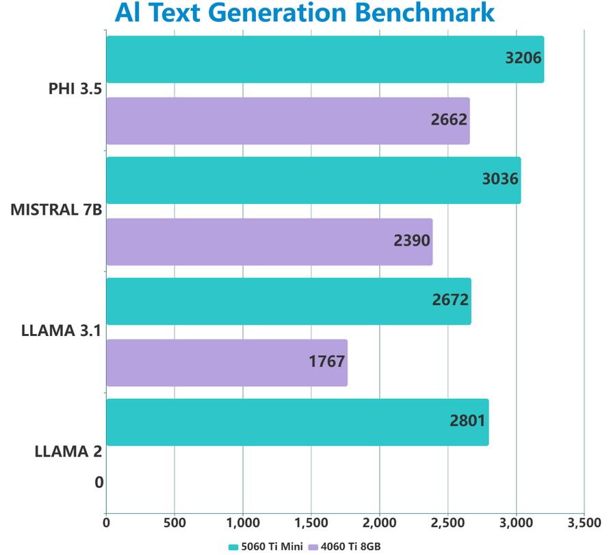 最後一項性能測試是使用Procyon Al Text Generation Benchmark測試顯卡的AI文本生成性能,iGame RTX 5060 Ti Mini在PHI 3.5、MISTRAL 7B、LLAMA 3.1、LLAMA 2四個模型得分是3206、3036、2672、2801,全面領先於RTX 4060 Ti 8GB,而且後者RTX 4060 Ti 8GB還無法進行LLAMA 2測試。