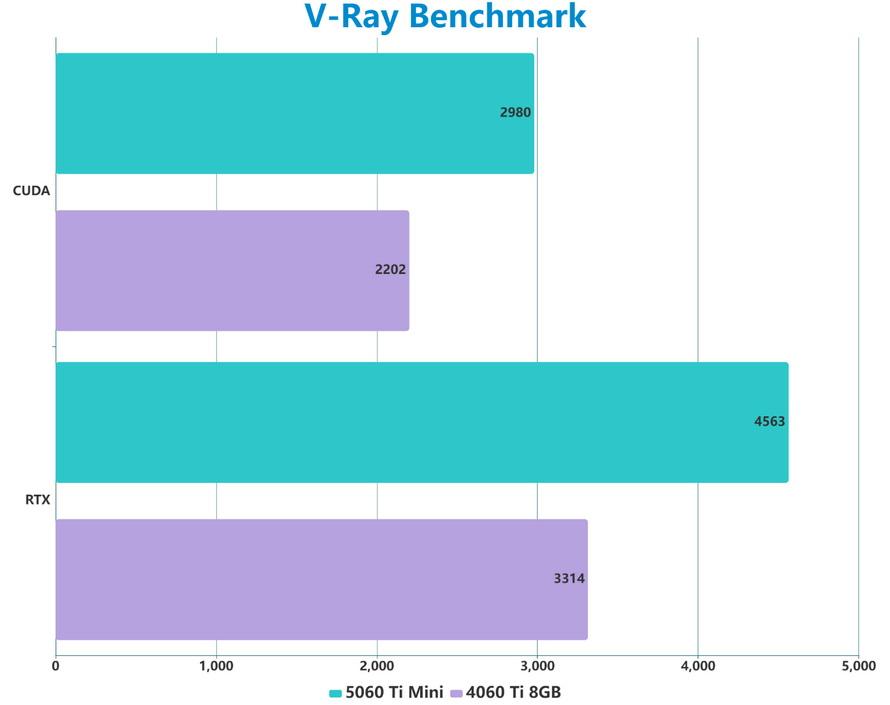 V-Ray測試主要用來評估電腦硬件的渲染性能,可用於測試CPU、GPU或者CPU+GPU的渲染能力,這次我們測試了顯卡的CUDA與RTX引擎性能表現。iGame RTX 5060 Ti Mini在CUDA、RTX中得分分別是2980、4563,比RTX 4060 Ti 8GB分別高出35.3%、37.7%,領先幅度比3DMark還要高。