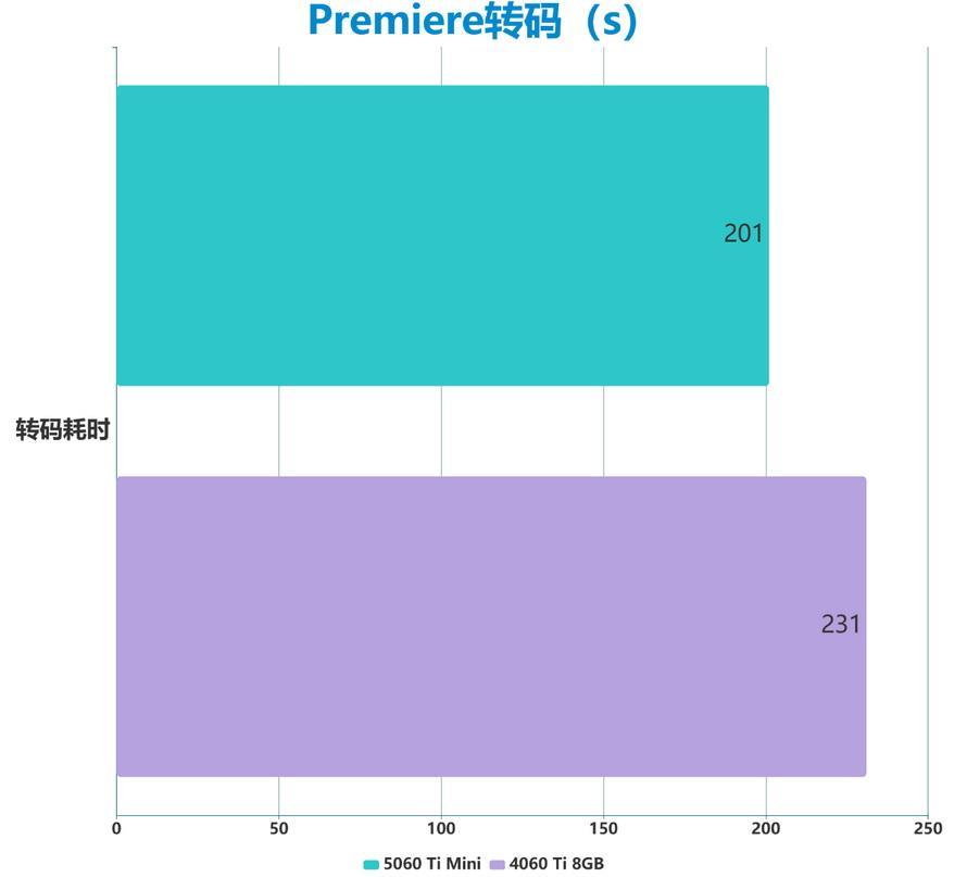 作爲一張擁有16GB顯存的顯卡,iGame RTX 5060 Ti Mini自然不僅能勝任遊戲,而且能成爲一件出色生產力工具。在Premiere Pro 2022中開啓GPU硬解碼,然後將一段時長10分鐘、10bit 422、H.264編碼的600Mbps碼率4K60P視頻,重新編碼成一段8bit 420、H.265編碼的50Mbps碼率FullHD60P視頻,實測RTX 4060 Ti 8GB耗時231秒即可完成轉碼,相同設定下RTX 4060 Ti 8GB耗時201秒,減少30秒,轉碼效率提升了14.7%。