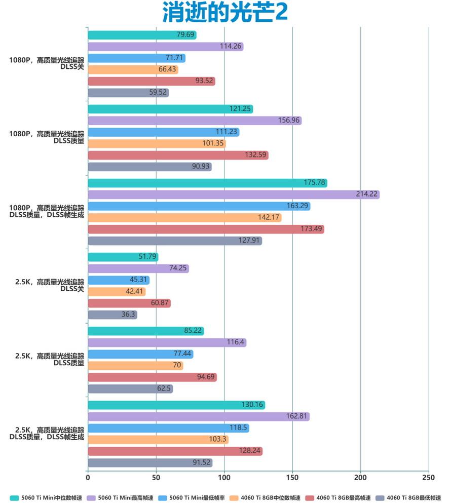 最後一款遊戲也是3A作品《消逝的光芒2:人與仁之戰》,在高亮光線追蹤+DLSS質量+DLSS幀生成下,iGame RTX 5060 Ti Mini在1080P、2.5K下平均幀速分別是175.78FPS、130.16FPS,比RTX 4060 Ti 8GB分別高出23.6%、26%。通過上述測試可以看出,iGame RTX 5060 Ti Mini在DLSS 4多幀生成加持下,遊戲平均幀速能比RTX 4060 Ti 8GB高出1倍左右,即使在不支持DLSS 4的遊戲中,幀速高出兩三成也是常有,比上一代顯卡提升非常顯著。