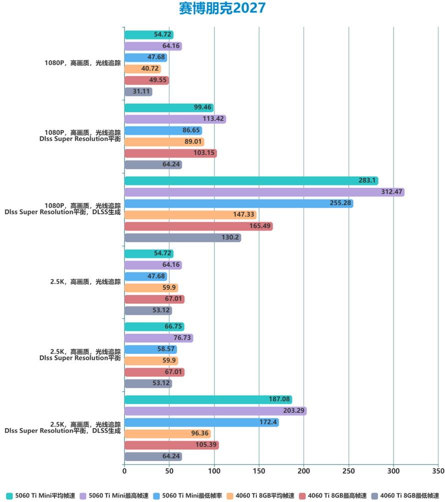 《賽博朋克2077》是一款經典3A大作,在今年初更新後支持DLSS 4技術,因此iGame RTX 5060 Ti Mini表現再次遙遙領先。在高畫質、開啓光線追蹤、DLSS Super Resolution平衡以及開啓DLSS幀生成下,iGame RTX 5060 Ti Mini在1080P、2.5K分辨率下,平均幀速分別是283.1FPS、172.4FPS,而RTX 4060 Ti 8GB對應平均幀速分別只有147.33FPS、93.36FPS,分別只有前者52%、54%性能。。