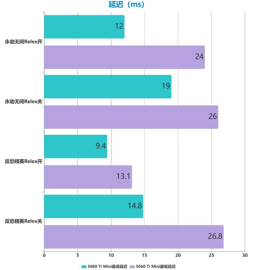 從遊戲測試中,DLSS技術對遊戲幀數提升是非常顯著的,但是它也有不足——增加延遲,爲此NVIDIA引入了Reflex技術來降低延遲。RTX 50更是支持Reflex 2技術,它能實時分析鼠標移動軌跡、微調畫面角度,按照官方說法它最多可以減少75%延遲,玩網遊時更爲順暢。我們使用了網遊《永劫無間》、《反恐精英》測試了iGame RTX 5060 Ti Mini在相同畫質設定下,測試了開關Reflex的遊戲延遲。在《永劫無間》中未打開Reflex時,遊戲延遲大概會在19~26ms之間波動,在開啓Reflex後,延遲會降低至12~14ms。在《反恐精英》中未打開Reflex時,遊戲延遲大概會在13.1~26.8ms之間波動,在開啓Reflex後,延遲會降低至9.4~14.8ms,效果非常顯著。