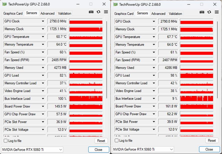 第二組測試是在運行Topaz Video AI時監控GPU,在長約一個小時AI任務中,iGame RTX 5060 Ti Mini整卡功耗去到162W左右,GPU溫度會在56~68℃之間波動。可以說,無論是烤機還是實際應用中,iGame RTX 5060 Ti Mini散熱表現都是讓人滿意的。