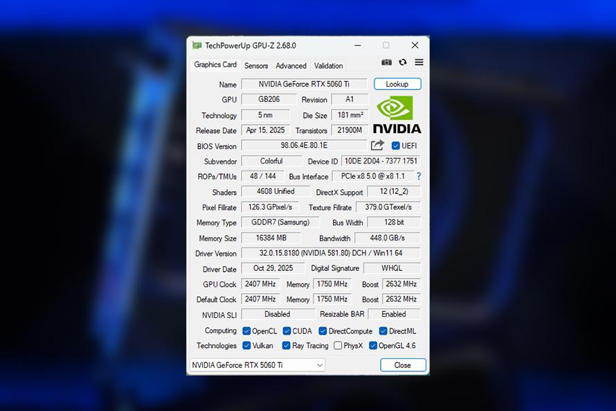 iGame RTX 5060 Ti Mini採用了基於Blackwell架構的GB206,CUDA核心數量達到了4608個,AI算力爲759TOPS,RT Core算力也達到72 TFLOPS,核心基礎頻率爲2.41GHz,與官方一致,加速頻率達2.63GHz,略高於官方頻率,同時搭載了16GB 128bit GDDR7顯存,帶寬提供了448 GB/s帶寬。測試中,加入了RTX 4060 Ti 8GB作爲對比。