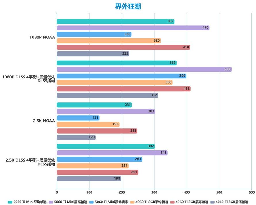 接下來是遊戲實測,《界外狂潮》是網易今年推出的新遊戲,是一款5v5英雄射擊網遊,支持DLSS技術。在高畫質+1080P NOAA場景下,iGame RTX 5060 Ti Mini平均幀速可以362FPS,比RTX 4060 Ti 8GB多出42FPS,畫質不變下提升至2.5K分辨率下,二者差距依然有38FPS,可見甜點級顯卡光柵性能依然能夠滿足網遊需求。