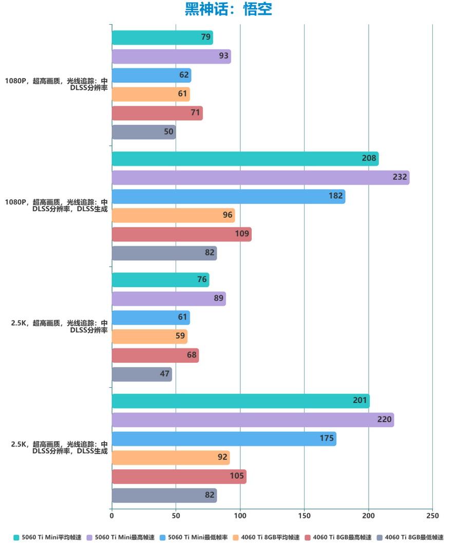 說到國產遊戲,自然不能少不了《黑神話:悟空》,這是國內第一部3A大作,總銷售量超2800萬份,在遊戲上線更是顯卡評測的“座上客”,而且這是一款支持DLSS 4技術遊戲,更能充分體驗iGame RTX 5060 Ti Mini潛能。在超高畫質、光線追蹤:中、DLSS分辨率設定下後 ,RTX 4060 Ti 8GB在1080P、2.5K分辨率平均幀速是79FPS、61FPS,設置不變下開啓DLSS 4進行AI插幀處理後,對應平均幀速分別飆升至208FPS、201FPS,有了質的提升。而只支持上一代DLSS技術的RTX 4060 Ti 8GB在相同設定下,1080P、2.5K平均幀速分別只有96FPS、92FPS,只有iGame RTX 5060 Ti Mini的46.2%、45.8%。